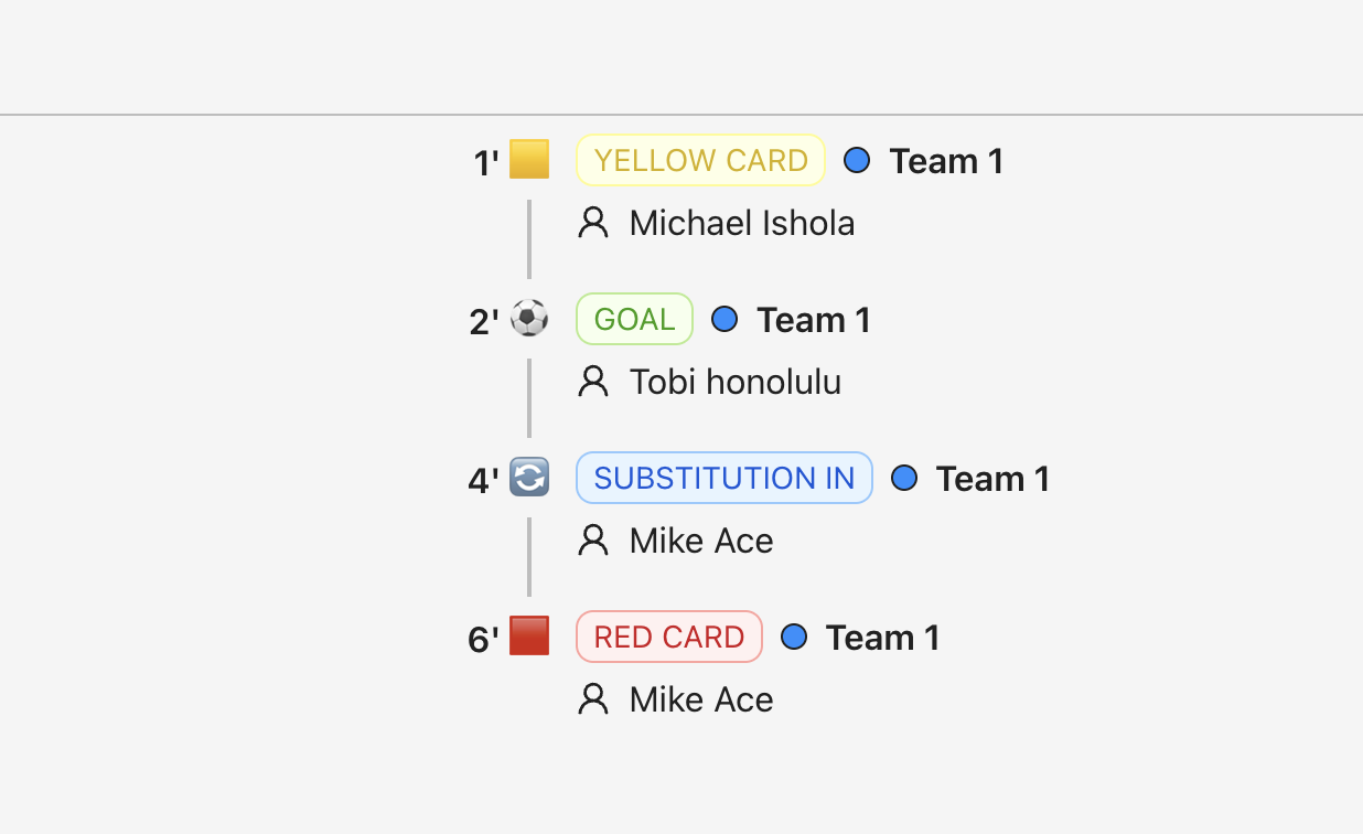 Capture goals, cards, and substitutions to maintain complete turf activity records.